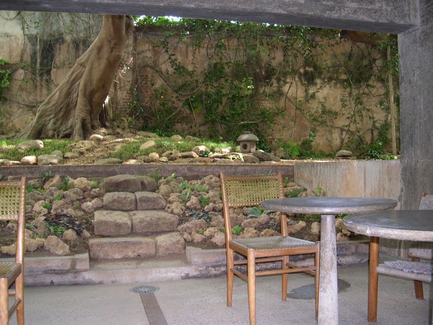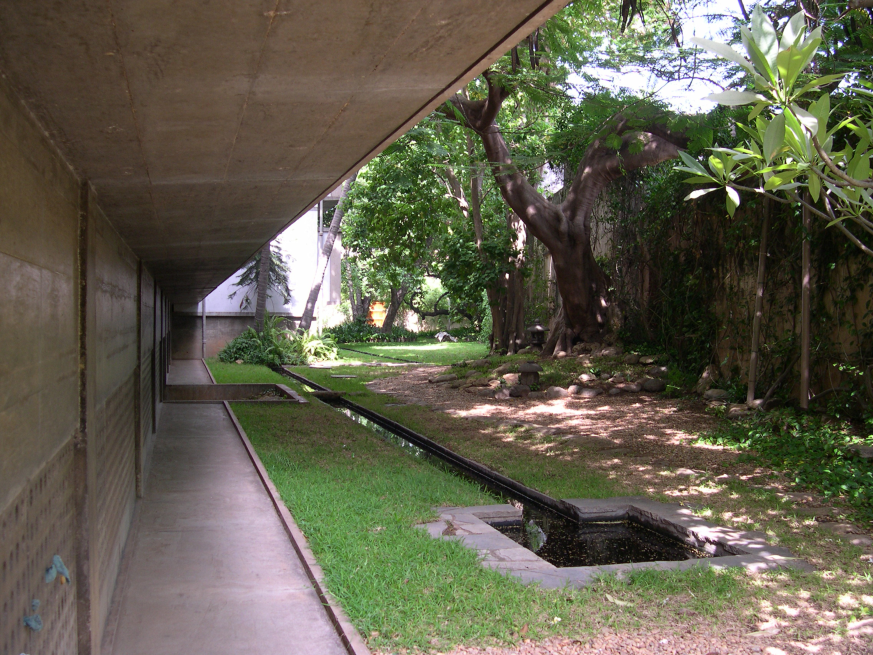 Probably in homage to his Japanese ancestry, a very small Japanese stone shrine was carved and placed at the front, in between the reflecting pool and the boundary wall (referring to image 42). This is the passage between the two breezeways just coming up the stairs and you can see beyond, straight through, is the Bay of Bengal (referring to image 43). Detail of that garden now (referring to image 44). This was a photograph that Christine, I think, took in 2003 when we were living there. The Gulmohar tree, which is now massive, essentially takes up the entire south garden (referring to image 45) and the south garden again (referring to image 49).