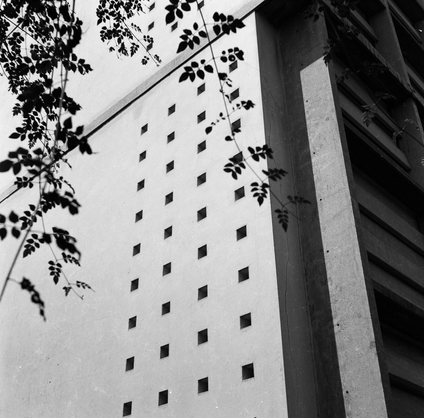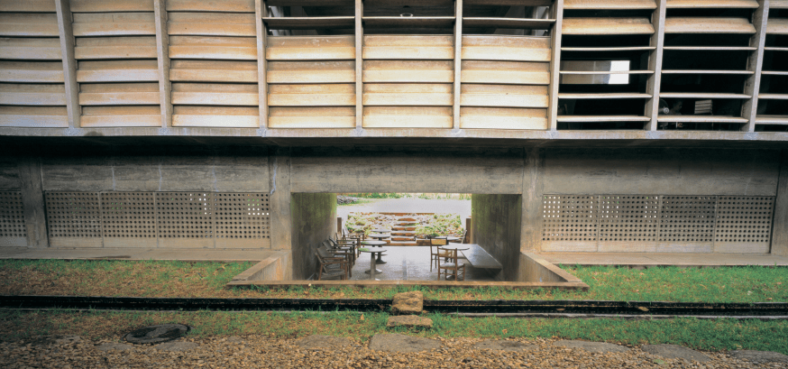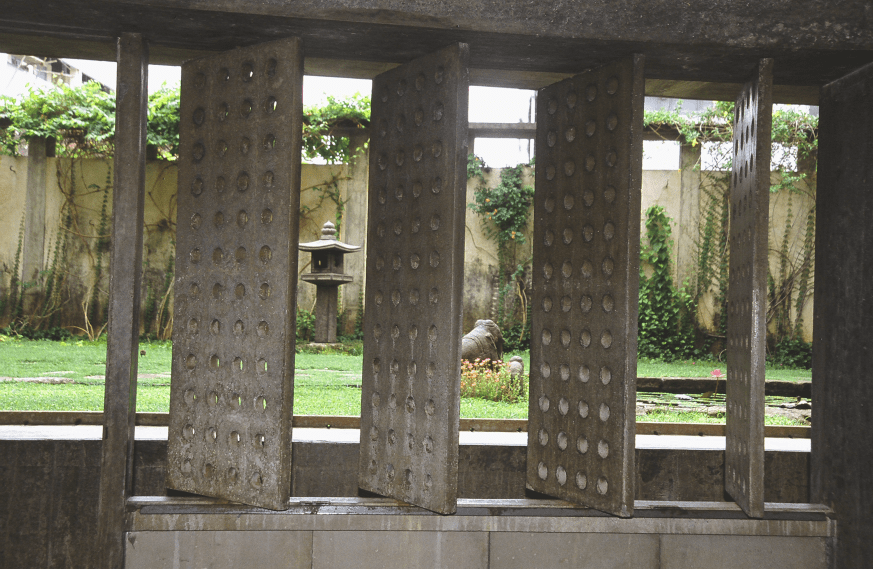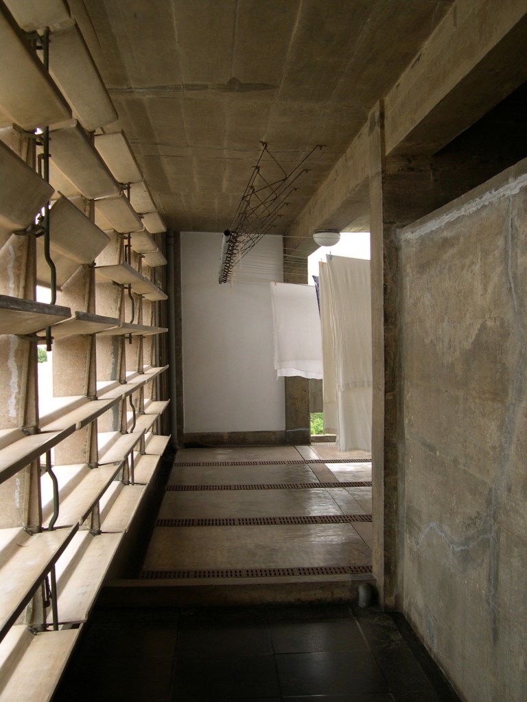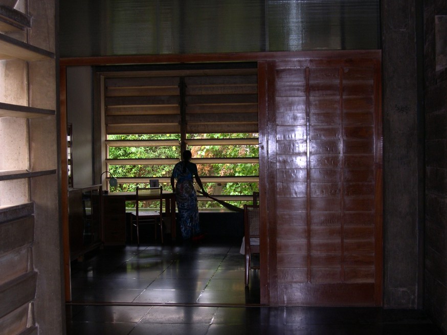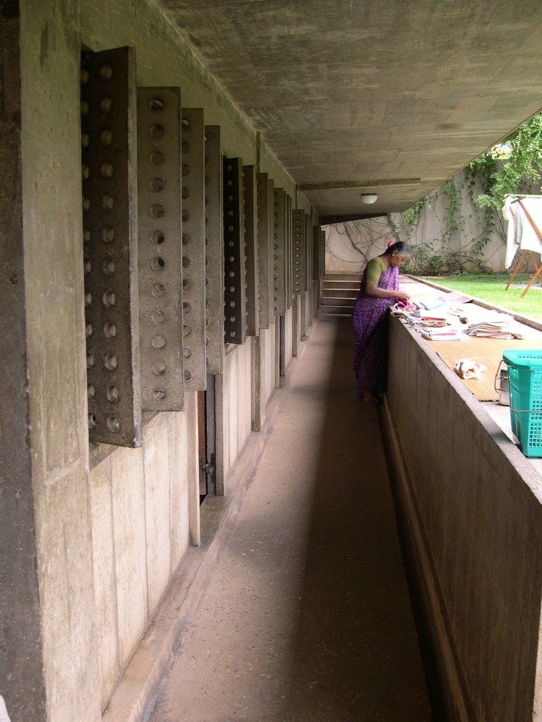 And, this is a typical corridor (referring to image 58). So, it is a single loaded corridor, the sliding teak doors are the doors to the rooms, and then the asbestos concrete louvers are the apertures to the garden. And even the design of the doors, the teak was woven. Since there was no electricity, there were no fans, the teak was woven so that the privacy would not be compromised but that with the louvers open, the breeze could come through the garden into the rooms, through the slatted openings of the teak louvers and the top was left translucent with fluted glass and the edges of the corridors have these circular openings cast into the concrete. So, it is a naturally breathing, passively ventilated building.