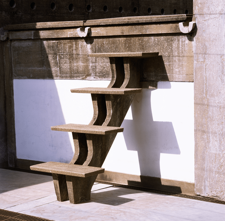 The louvers through which you glimpse the garden (referring to image 78), all the hardware, the bolts, the handles, all cast on-site and brass against the polish of the teak (referring to image 79). The teak is oiled every three years. It has been a non-stop continuous practice at the Ashram every three years. All of the teak is oiled. The lamps that were made for each room (referring to image 80). The hinges and the hardware for the teak doors are directly embedded into the RCC (referring to image 81), into the concrete frame. And I think probably the most beautiful first piece of concrete cast in this country, the laundry stair, I mean, such a profound act of sculptural elegance (referring to image 82). And this one was pre-cast. It was pre-cast in the gardens of Golconde and then carried upstairs and assembled for the upper terrace of the laundry.