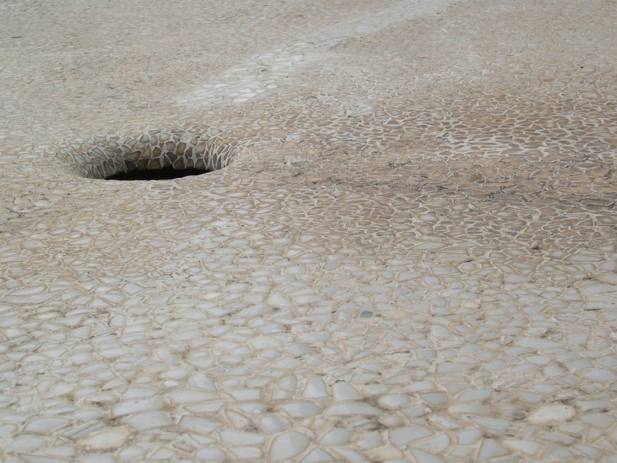 Now that lower floor where you see the small circular apertures in the concrete (referring to image 47), that was all the services. So, there was a pantry, there was a laundry room, there was a staff room for the staff that comes every morning to wash and clean the building, and literally the building is washed and cleaned. All the walls are scrubbed, and the floors are scrubbed. The walls have no paint, the walls were pigmented; layered with a pigment made with albumin, eggshells crushed with lentils and seashells, and it was a primitive version of lime plaster. They were all plastered and they have never been re-plastered since. So, they are washed once a week with wet rags, but the floor is cleaned every single day. Once a year with razor blades, all the kadappa stone is scrapped by hand.