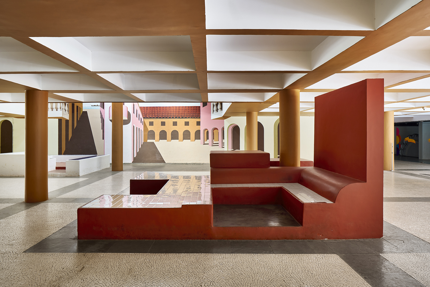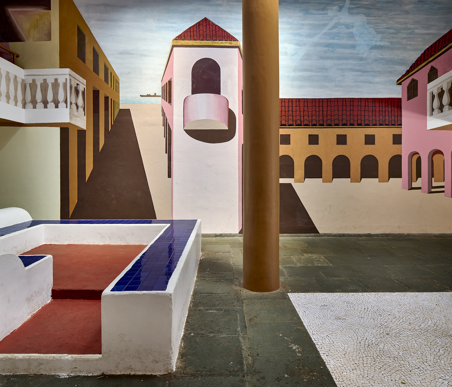 Further down the street as it heads to the river is the main square of the metaphorical town that Correa is evoking. This is a double- height space with skylights above. The walls of this space are painted with facades of buildings in the distorted perspectives that recall the work of the Italian painter Giorgio de Chirico. Like in his work, the drawings are reminiscent of a square in a city where strange things seem to occur. A boy stands on a balcony and watches us from above. A staircase leads up to the upper floors but also disappears into the illusory space of the wall. A painted window with the traditional oyster shell technique used in Goa at first appears to be fake, but turns out to be real, overlooks the library to the rear. In a corner, the architects Mies Van Der Rohe and Le Corbusier have a conversation with each other near the sea with a ship sailing in the distance. In this space, and indeed in the whole building, Correa is drawing on surrealist traditions of collage. Different people, spaces and times meet and encounters are staged between them – and with us. We are transposed into those encounters. We join them as performers. Our lives are played out with them. That is really the power of stories. In them we see ourselves, but also outside ourselves. It allows us insight into our place in the world through reflection and through difference. The Kala Academy revels in those possibilities.