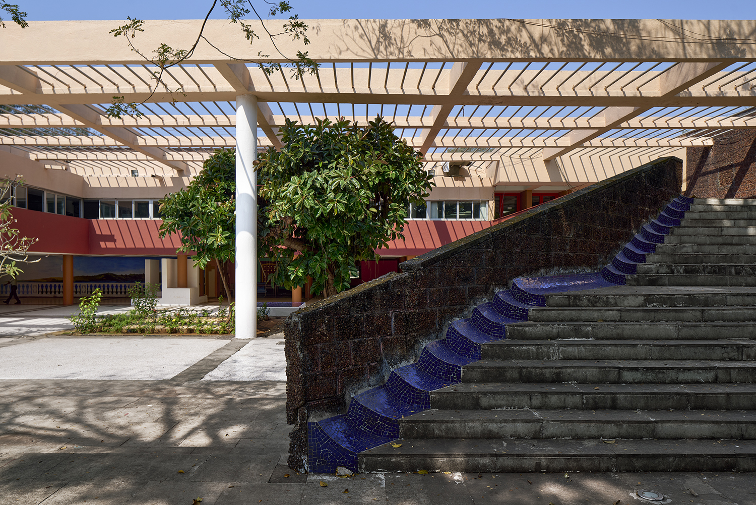 It would be remiss of this essay to not address one of the main reasons that Kala Academy has been in the news at the time of publication of this book. The building underwent a series of transformations when it was converted into the main venue for the International Film Festival of India in 2004. These included turning the main auditorium into a screening space along with other changes to the layout. Many of the older paintings on the walls were also redone – however, with harsher outlines and colours. The offices of Charles Correa were not consulted on any of these changes. In July of 2023, a part of the roof over the stage of the amphitheatre collapsed. This has raised questions and criticism among the public about the government’s decision-making process and reasoning. Currently this controversy still rages and the building is in urgent need of attention. Many civil society groups and architects, spearheaded by the Charles Correa Foundation, have tried to find ways of raising awareness about the building and protect it.
