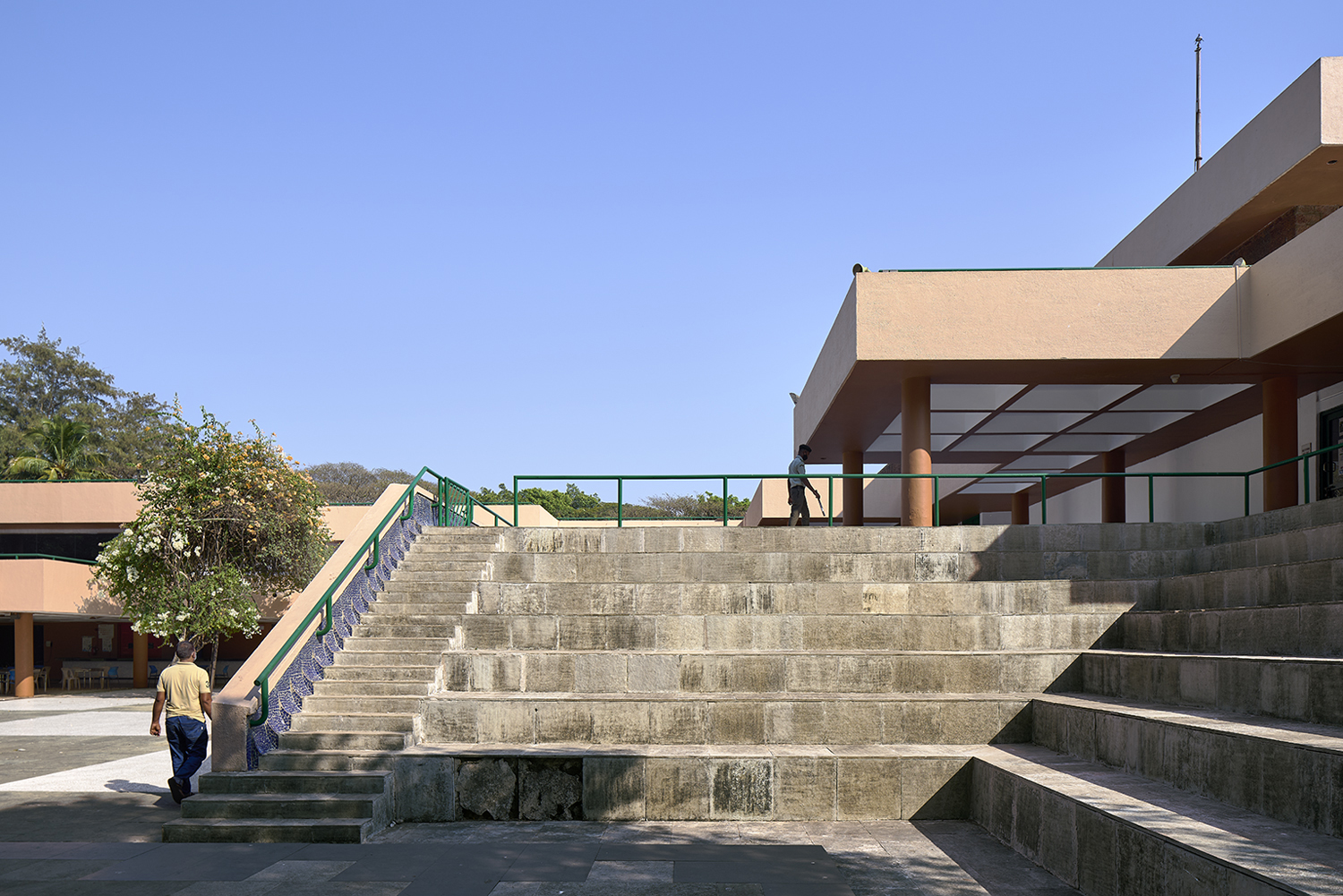 This interest in the cinematic sequencing of events is at the heart of the design of the Kala Academy. This is not merely a building but a backdrop for the performance of modern life. It is the street that Correa evokes as the stage for this purpose. The project is structured as a series of distinct scenes strung loosely along a path of movement. In each of these scenes, he seems inspired by some of the devices of the design of theatres, perhaps from Tiatr, the uniquely Goan tradition of theatrical performance. Tiatr performances usually involve 6 or 7 acts of short duration, usually around 15 minutes each and performed in Konkani. Tiatr combines elements of music, drama, comedy and social commentary and often feature live music, singing, dancing, and colourful costumes.
